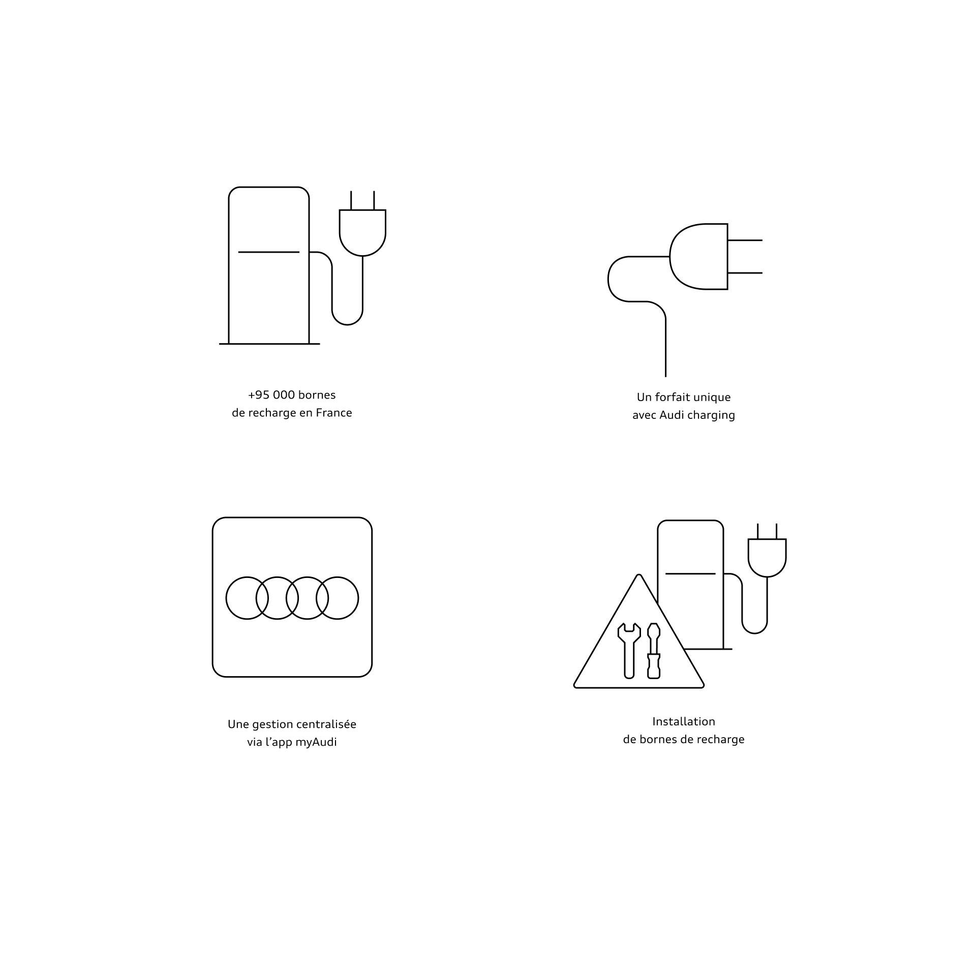 (10) Audi charging est une offre de Volkswagen Group. Accès et réseau : le nombre de points de charge accessibles est en constante évolution. Audi charging ne peut être utilisé que pour les modèles électrifiés de la marque Audi (un numéro d'identification du véhicule est requis). Accès dans toute l'Europe : lla recharge Audi sera disponible dans les pays suivants à partir du 01/01/2023 (selon les informations du 01/01/2023) : Allemagne, Autriche, Belgique, Bulgarie, Croatie, Danemark, Espagne, Estonie, Finlande, France, Grèce, Hongrie, Irlande, Italie, Lettonie, Lituanie, Luxembourg, Norvège, Pays-Bas, Pologne, République tchèque, Roumanie, Slovaquie, Slovénie, Suède, Suisse et Royaume-Uni. Le nombre de points de recharge fournis est propre à chaque pays et dépend du degré de développement de l'infrastructure disponible. Il n'y a pas de droit d'accès à toutes les bornes de recharge dans un pays. AUDI AG ne garantit pas le fonctionnement, la disponibilité, la performance de charge ou toute autre caractéristique de l'infrastructure de charge. Les informations de localisation concernant le nombre de points de charge sont mises à jour régulièrement ; aucune garantie n'est donnée quant à leur exhaustivité. L'authentification via myAudi App (code QR sur la borne de recharge) nécessite une radio active et une connexion Internet. Toutes les méthodes d'authentification ne sont pas disponibles sur tous les points de charge. Les prix au sein des différents pays européens peuvent différer.