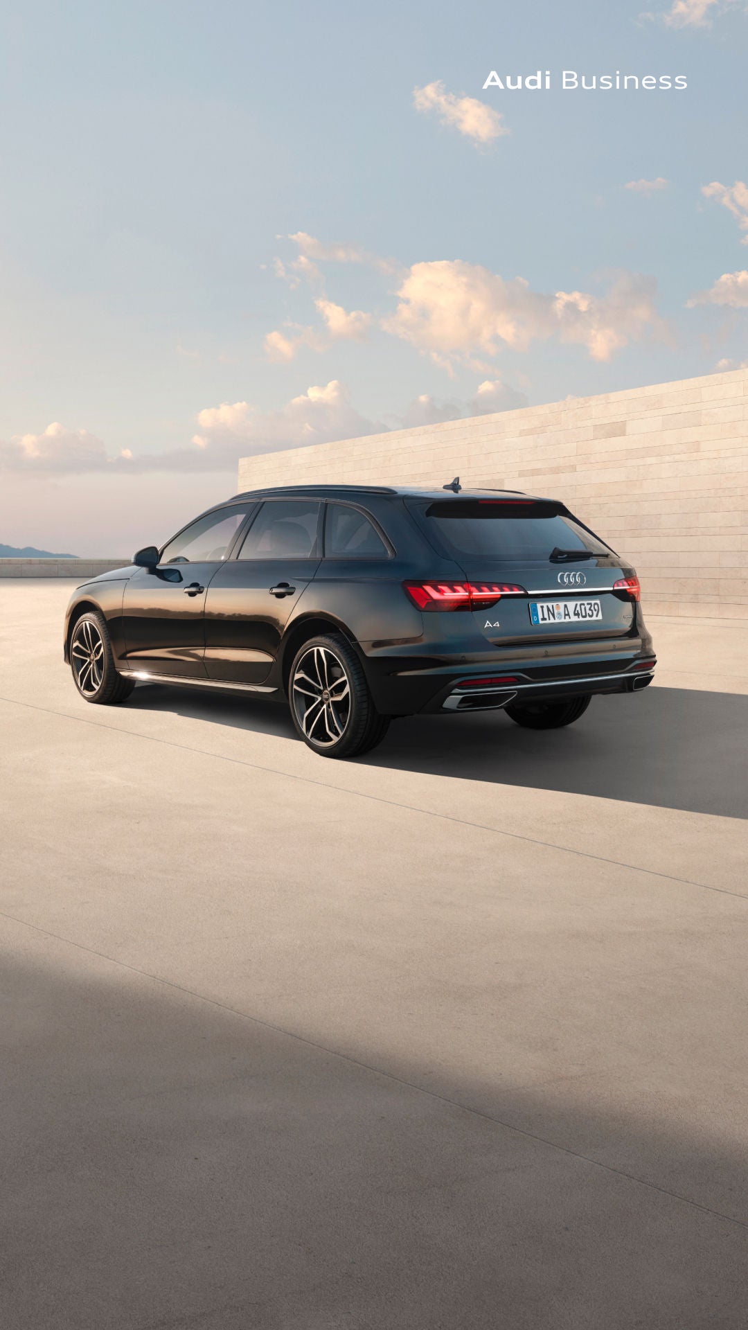 Modèle présenté : Offre de location longue durée sur 37 mois et 30000 kilomètres pour une Audi A4 Avant Avus 35 TFSI S tronic hors options, 37 loyers de 630€ avec perte financière (4), contrat de maintenance aux professionnels et véhicule de remplacement (5) inclus. Offre valable du 1er juillet 2024 au 31 août 2024. Réservée à la clientèle professionnelle, hors taxis, loueurs et flottes, chez tous les distributeurs Audi présentant ce financement, sous réserve d'acceptation du dossier par Audi Business division de VOLKSWAGEN BANK GMBH - SARL de droit allemand - Capital social : € 318 279 200 - Siège social : Braunschweig (Allemagne) - RC/HRB Braunschweig : 1819 - Intermédiaire d’assurance européen : D-HNQM-UQ9MO-22 (www.orias.fr) - Succursale France : Bâtiment Ellipse, 15 avenue de la Demi-Lune - 95700 Roissy-en-France - RCS Pontoise : 451 618 904 - Administration et adresse postale : 11, avenue de Boursonne - B.P. 61 - 02601 Villers-Cotterêts Cedex. Montants exprimés TTC, prestations (4)(5) incluses.